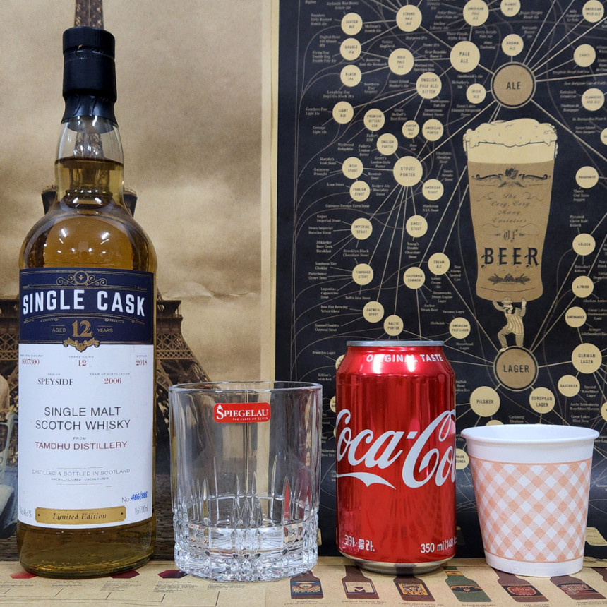 실제 상품과 700ml의 위스키병, 350ml의 콜라캔,